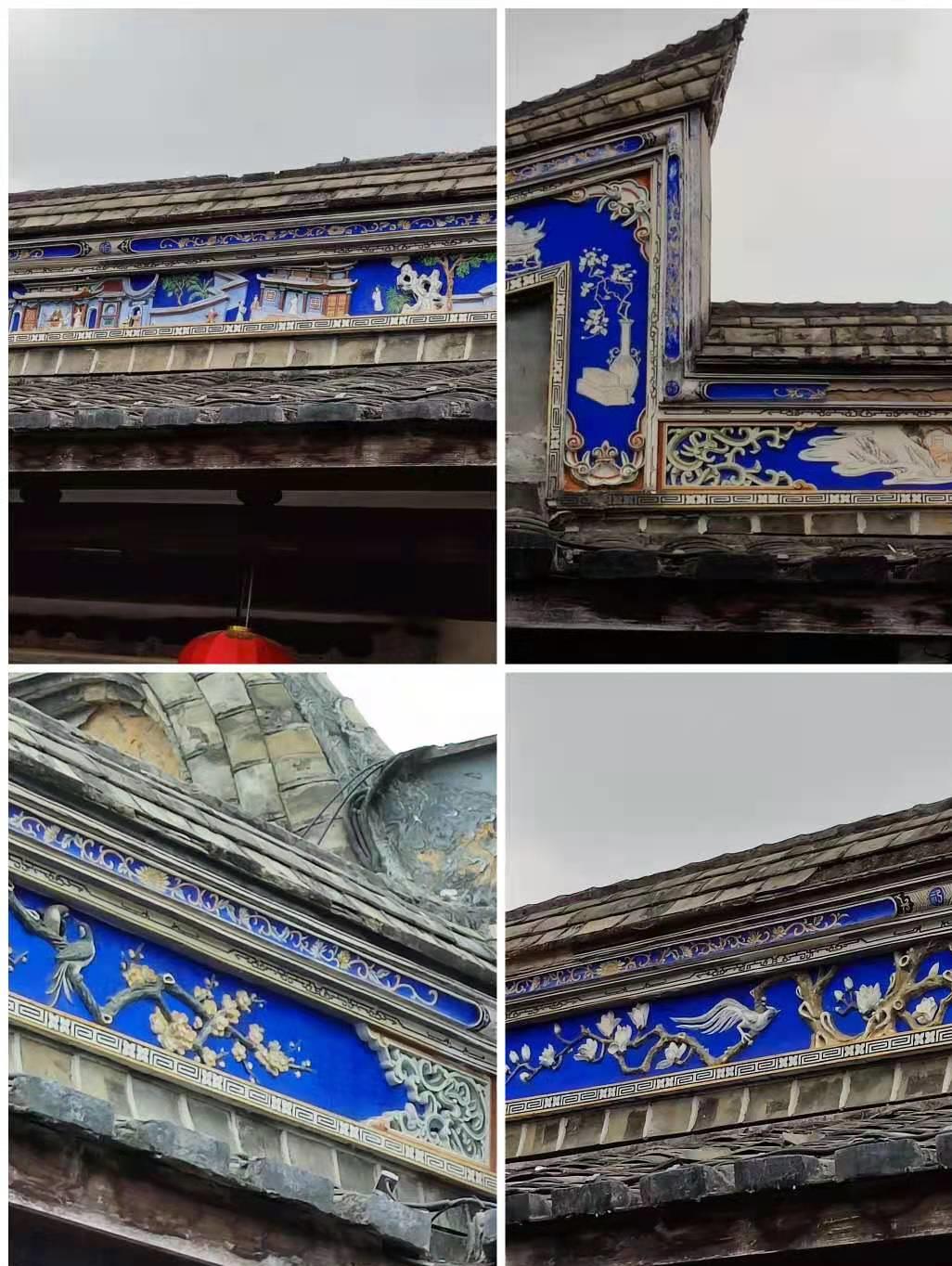 进入大门,就有个天井,可以回头看看墙头上的灰塑和彩绘。我有去过佛山的祖庙,那墙头上的灰塑、陶塑、砖雕等才叫人叹为观止。