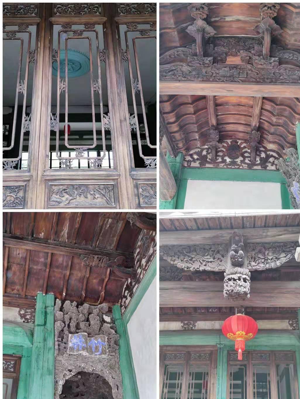 楼两侧靠墙是糯米与三合土制成的雪洞,至今保护完好。楼前天井,对面太湖石垒成的假山,小巧鱼池,拱形小石桥跨越其上,桥栏板上刻"知鱼乐处"四字。东侧一座半边凉亭,垂柱上刻有松鼠、燕雀、蜻蜓、谷穗、玉米等,亭周12个悬钟,极致精巧。庭内花木扶苏,环境清幽,格调高雅,具有江南园林的特色。整座花园四周围墙,自成院落。