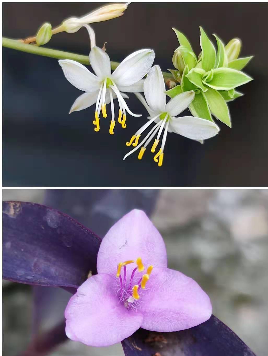 上图是随处可见的盆栽植物-吊兰;下图是紫鸭跖草,也叫紫竹梅。