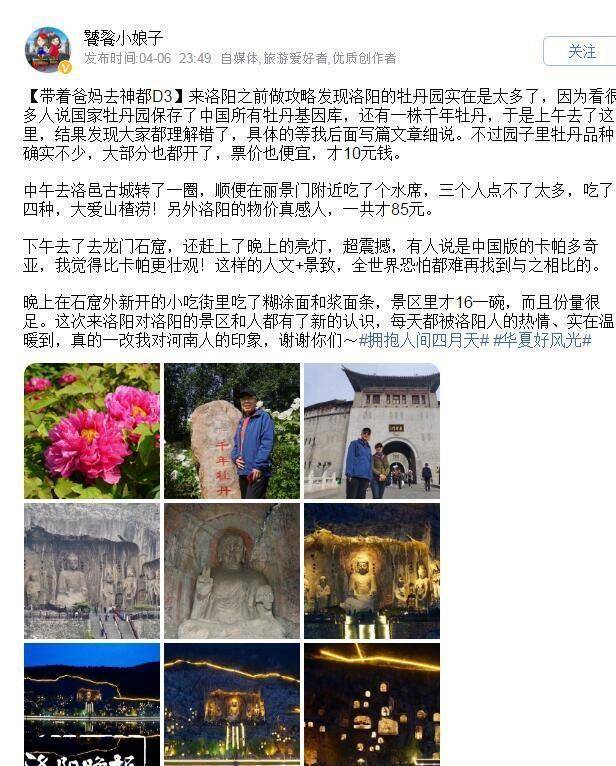“这次来洛阳,对洛阳的景区和人都有了新的认识,每天都被洛阳人的热情、实在温暖到……”6日,网友“饕餮小娘子”将自己清明节前后在洛阳旅行的经历发布在微博上,引发众多网友、游客共鸣。