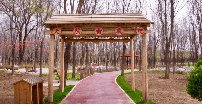 公园的小路已修整一新,平坦宽敞;用林地废弃木修建的吊脚亭、牌楼、栅栏、栈道日渐完善;公园里还有一棵老榆树,据说树龄已有近百年,来遛弯儿的村民总不忘时不时来看看它。