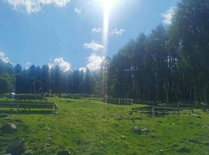 茂密的杉林和青青的草甸间骏马牛羊在悠闲地吃草,弥漫着的浪漫气息,让人不由地驻足停留,想把这个画面装进相机里。