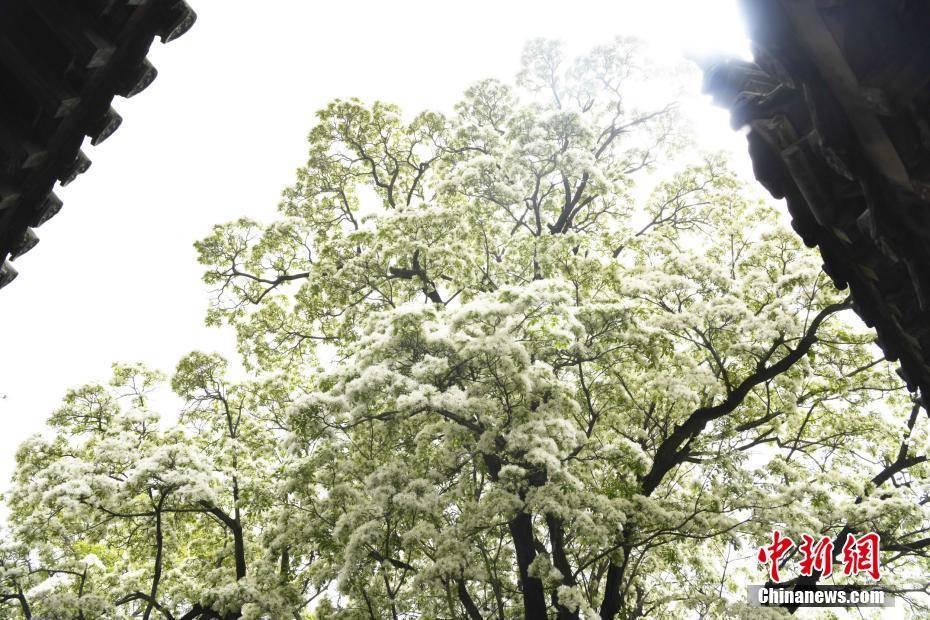 4月12日,山东济宁,邹城市千年孟府赐福楼前高大优美的流苏树繁花绽放,美如白雪。暮春时节,山东济宁邹城市孟府赐福楼前的流苏花如期绽放,洁白的花儿香气四溢,与千年孟府的建筑相映成景。
