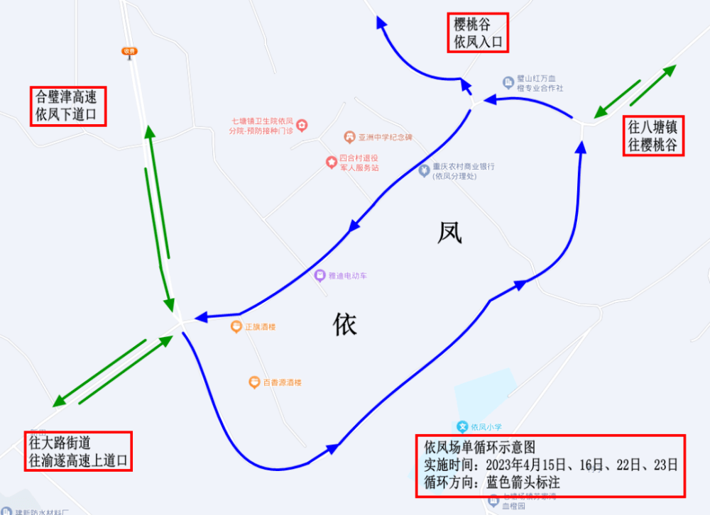 4月15日、16日、22日、23日将在依凤场实施单循环通行,具体循环线路如图所示。