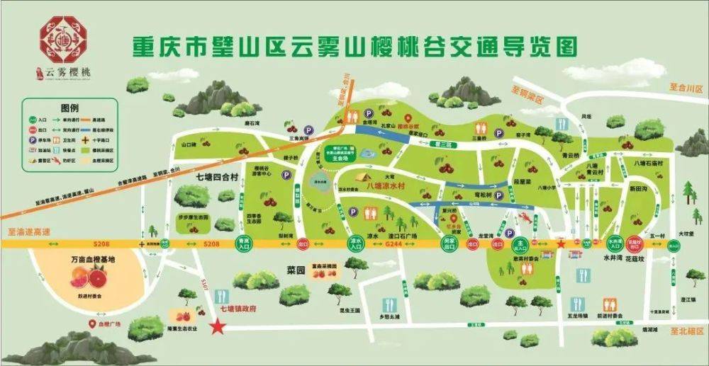 自驾游游客在渝遂高速大路收费站、璧山北收费站、合璧津高速依凤收费站下道,经国道G244线往八塘方向行驶,在沿线各进出口按指示进入樱桃谷采摘基地。