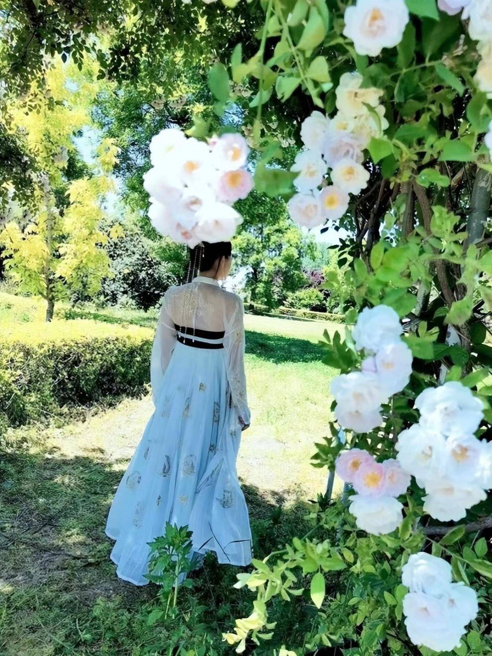 着霓裳看芳菲,一颦一足,嬉戏游园,春风轻拂“罗衣何飘飘,轻裾随风还”,最是好春光。