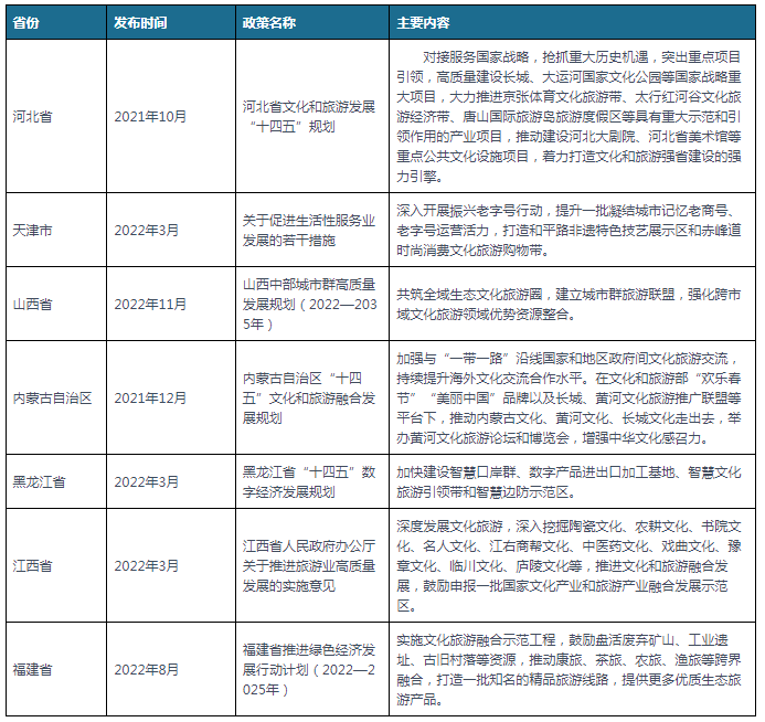为了响应国家号召,各省市积极推动文化旅游行业的发展,比如河北省发布的《河北省文化和旅游发展“十四五”规划》对接服务国家战略,抢抓重大历史机遇,突出重点项目引领,高质量建设长城、大运河国家文化公园等国家战略重大项目,大力推进京张体育文化旅游带、太行红河谷文化旅游经济带、唐山国际旅游岛旅游度假区等具有重大示范和引领作用的产业项目,推动建设河北大剧院、河北省美术馆等重点公共文化设施项目,着力打造文化和旅游强省建设的强力引擎。