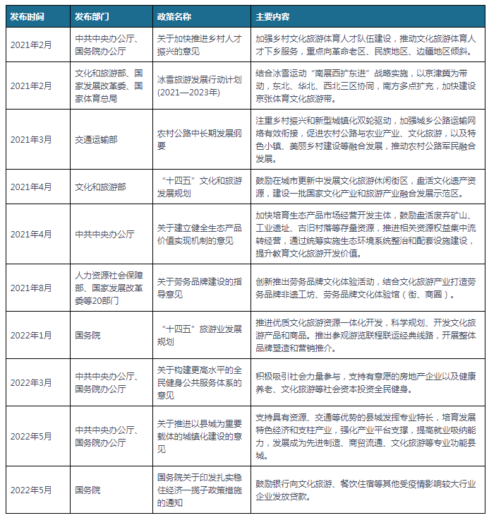 根据观研报告网发布的《中国文化旅游综合体行业发展趋势研究与投资前景调研报告(2022-2029年)》显示,近些年来,为了促进文化旅游行业的发展,我国陆续发布了许多政策,如2022年中共中央办公厅、国务院办公厅发布的《关于推进以县城为重要载体的城镇化建设的意见》支持具有资源、交通等优势的县城发挥专业特长,培育发展特色经济和支柱产业,强化产业平台支撑,提高就业吸纳能力,发展成为先进制造、商贸流通、文化旅游等专业功能县城。