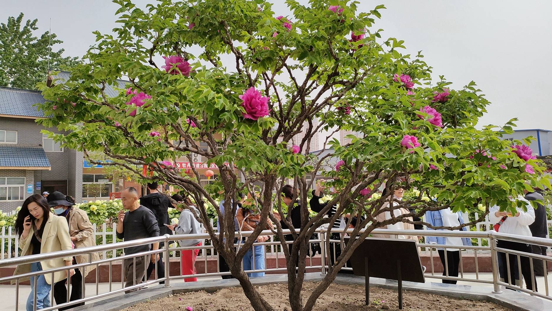 4月13日,明代“牡丹王”紫云仙前聚集了众多游客。看到紫红色的花朵在微风中摇曳,不少游客忍不住啧啧称赞。据中国牡丹芍药学会副秘书长庞志勇介绍,明万历三十五年(1607年),王氏先人王秉国栽种下这株牡丹,距离现在已经400多年了。王秉国字驭黎,是明代户部尚书郭允厚的老师,因其手植,所以这株牡丹又名王红。时光荏苒,这株牡丹一直生机旺盛,至清代岁贡王孜诵重修古今园时,紫云仙可以花开六百余朵,世人称其为“牡丹王”。紫云仙冠达三米,目前正处于盛花期,花开40余朵。