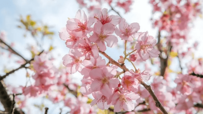 樱花按开花时间不同,有早樱、中樱、晚樱的说法。相传,这个划分是以染井吉野的花期为参照,比它开花早的是早樱,同期的为中樱,比它晚开花的为晚樱。早樱常在3月中下旬盛开,如今的早樱大多已经凋谢,而4月正是赏晚樱的好时节。