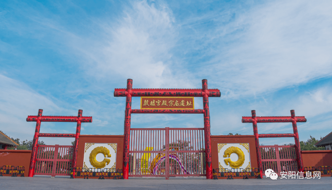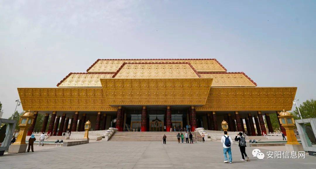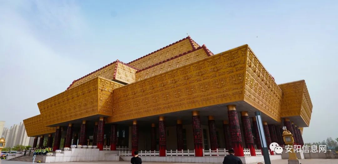 远远望去,金檐金瓦,令人遥想殷商时期“四阿重屋”的宫廷风韵;红黑图案的雕墙和雕柱,带着殷商文化的庄重辉煌。