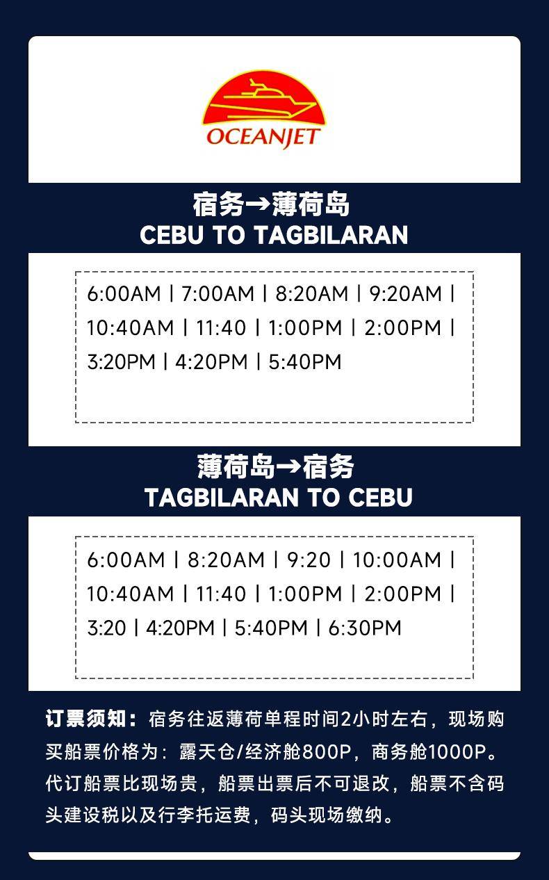 宿务到薄荷岛oceanjet船只一天一般有十趟左右,淡旺季会有所 调整。