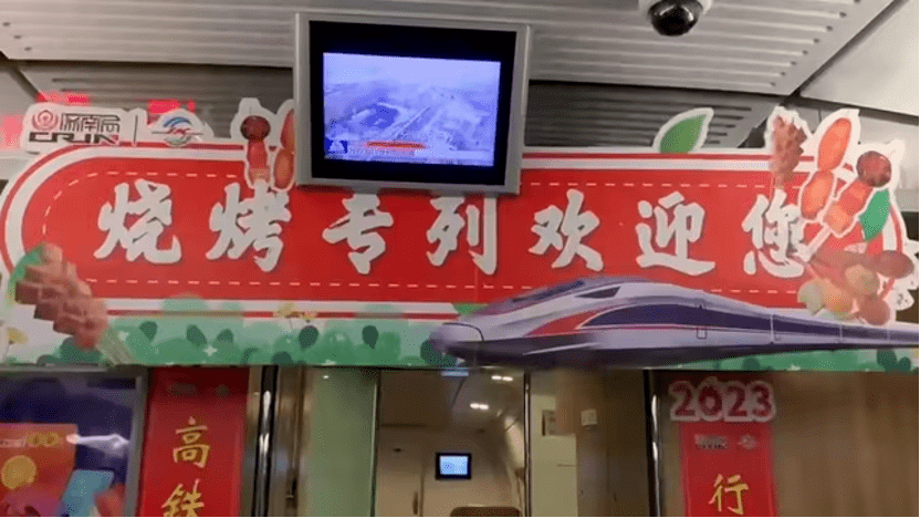 公交车站口,“烧烤专线”指示牌也被司机摆放在车窗前。