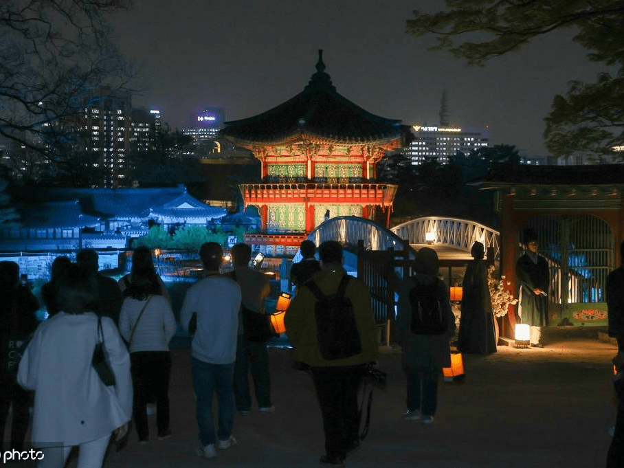 韩国首尔,在景福宫举行的“景福宫星光夜行”活动中,出席者们正在参观一座亭子。