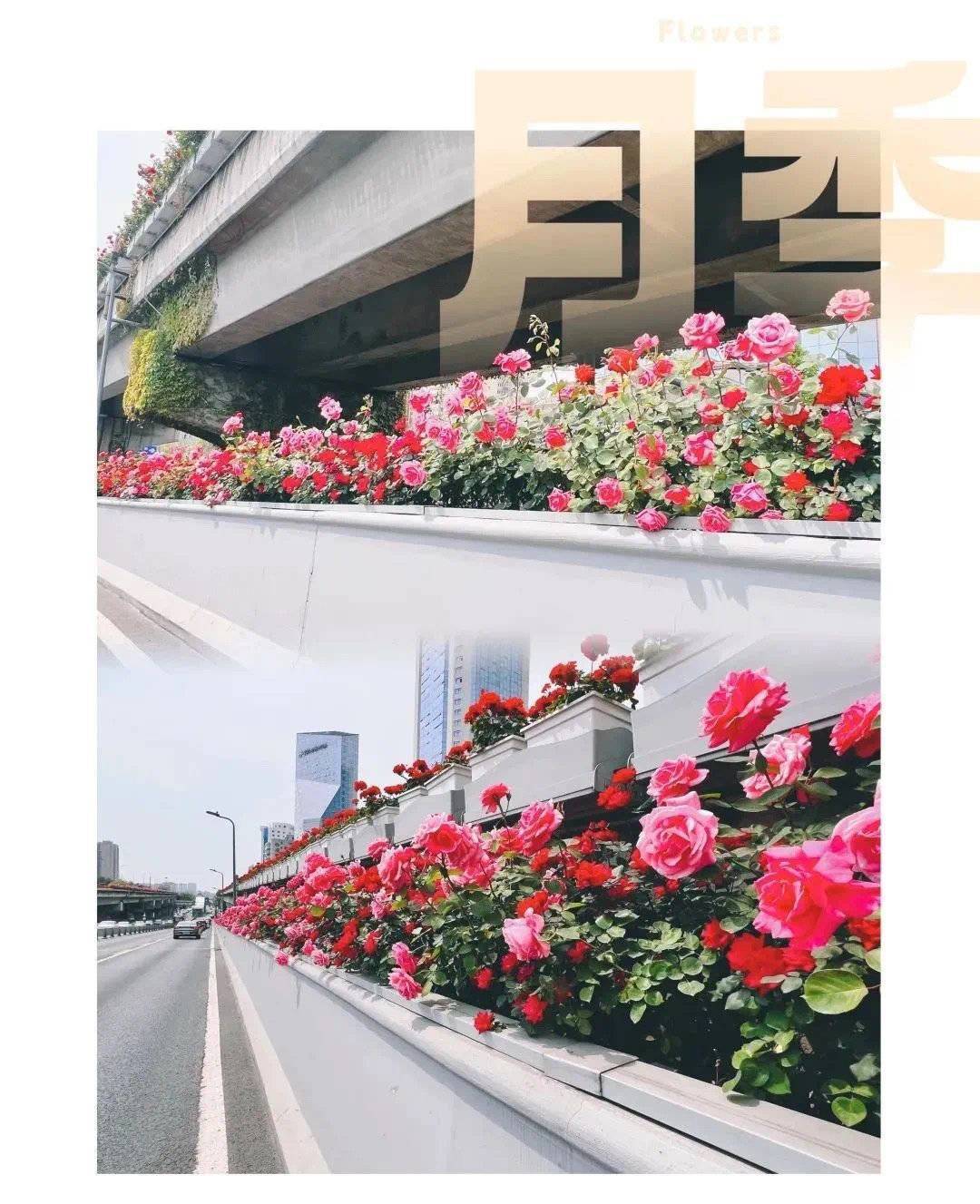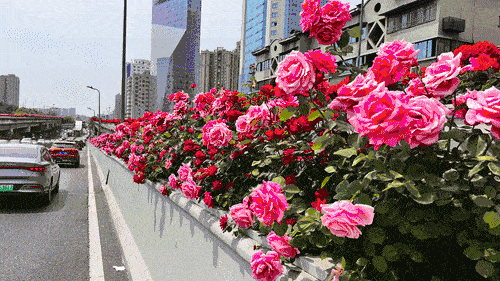 近日,不少市民开车行驶在成都二环高架上时,都忍不住被两侧绽放的月季花吸引了目光。这些盛开的月季形成了一条“空中花带”,让来往的汽车仿佛行驶在花环里。