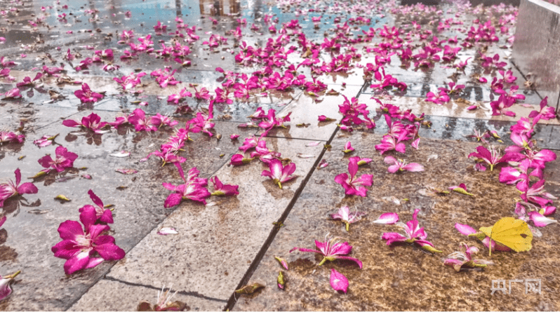 春雨过后,紫荆花给地面铺上粉色“地毯”(央广网记者 罗兰 摄)