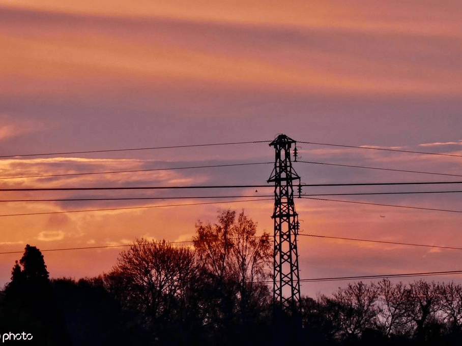 树林中的电线塔伫立在晨光之中,显得那么宁静。