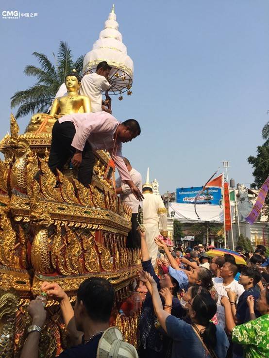 其实宋干节并非只有泼水这项活动,对于泰国人来说,宋干节如同中国的春节,也是阖家团聚、共享天伦之乐的节日,同时也是泰国的敬老节以及传承民族传统文化的重要时刻。宋干节最重要的一项传统习俗,是晚辈将混合香水和鲜花花瓣的清水缓缓淋在长辈手里,表示对长辈的尊重,长辈则将水淋在晚辈的头上,表达美好的祝福。按照习俗,人们白天要到寺庙中浴佛、堆沙塔、插彩旗。