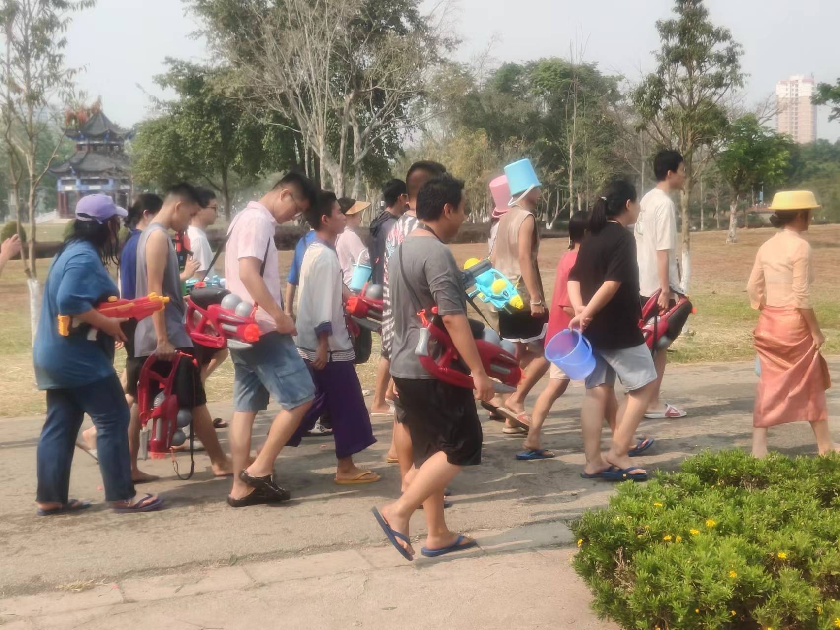 下午两点多钟,天气晴朗,气温在30度左右。前往弄莫湖公园的道路逐渐拥挤起来,大街小巷都开始了泼水活动。有人拿着水枪和水桶,互相泼水,也有人把水桶套在头上自我保护,或者直接背上喷雾器。在弄莫湖公园附近,仍然有人在售卖水枪、手机防水袋、水桶等。