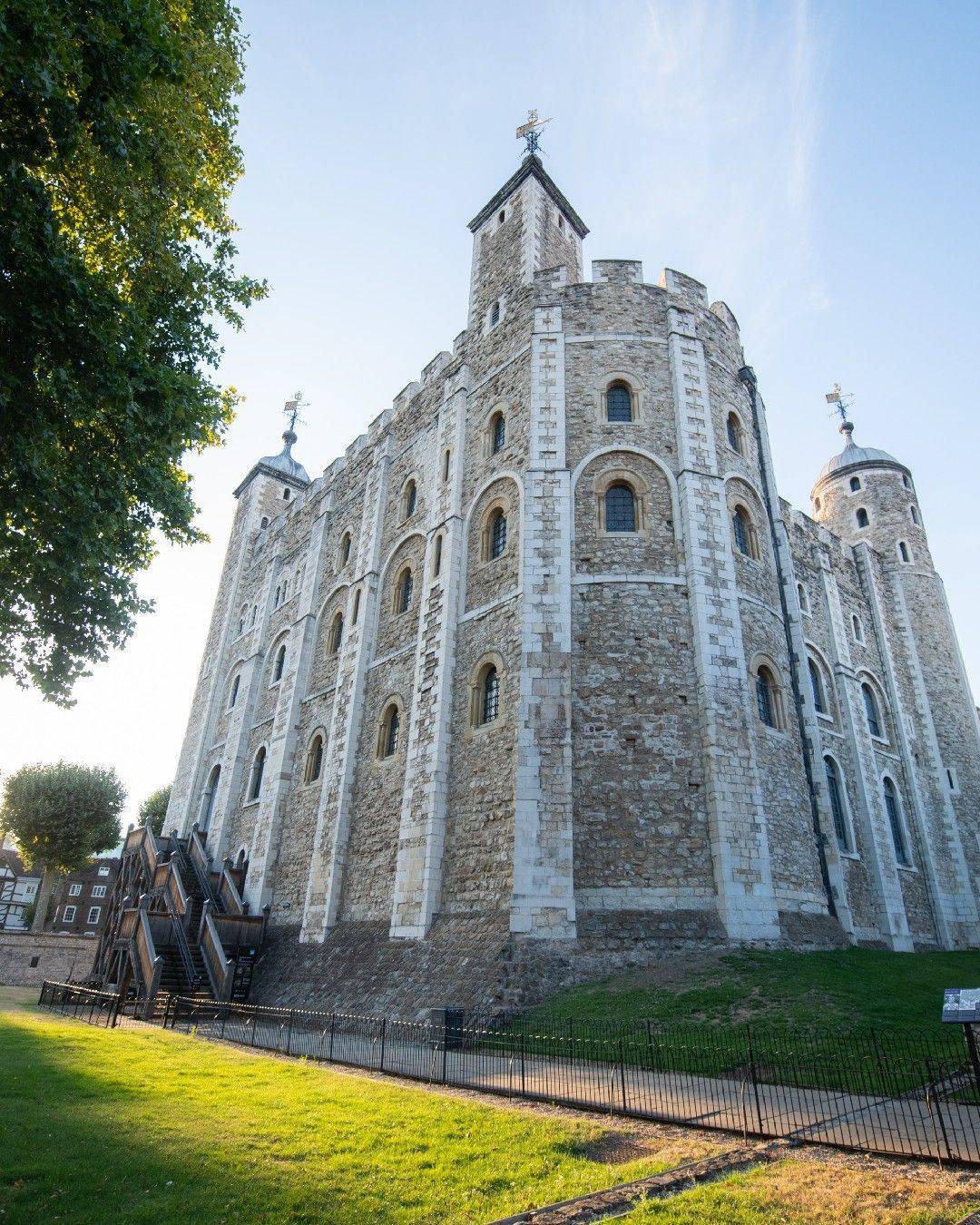 在伦敦塔的众多建筑中,宏伟的白塔是诺曼底军事建筑的典型,对整个英国的建筑风格产生了巨大影响。白塔塔楼高32.6米,分为三层,四角耸出的四座高塔呈三方一圆的形状,内部设建有螺旋楼梯通至顶层。白塔内展示了世界一流的古老皇家军械库藏品,许多独特的武器和盔甲,以及17世纪以来的君主王冠、权杖及王室珠宝。