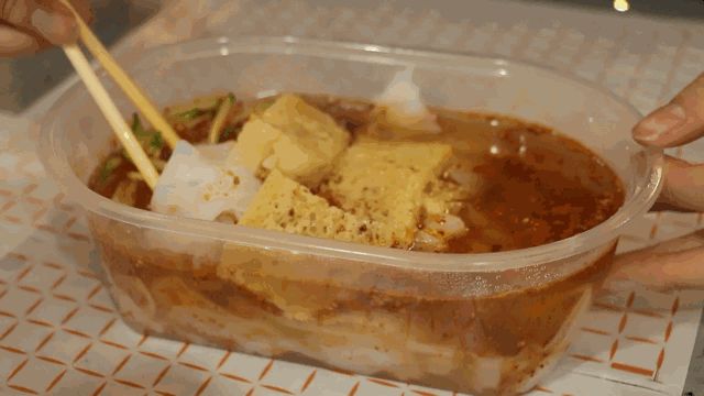 打开餐盒,凉皮薄如纸,明如玉,弹性十足。它融入川菜中的“麻”、湘菜中的“辣”,因而十分爽口,不一会儿就会被大家消灭。