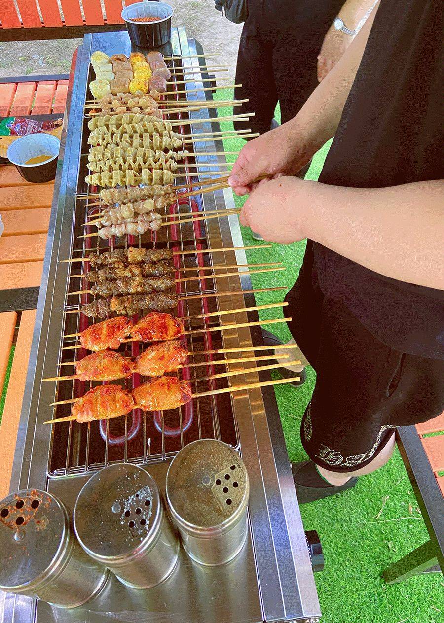 郊游最快乐的事莫过于烧烤了,在家提前准备切块腌制的肉、蔬菜等,到了目的地后,支好烤架,放上签好的肉串、菜串,再洒上适量的盐和孜然,简单的调料就开始烤制出诱人的香味。