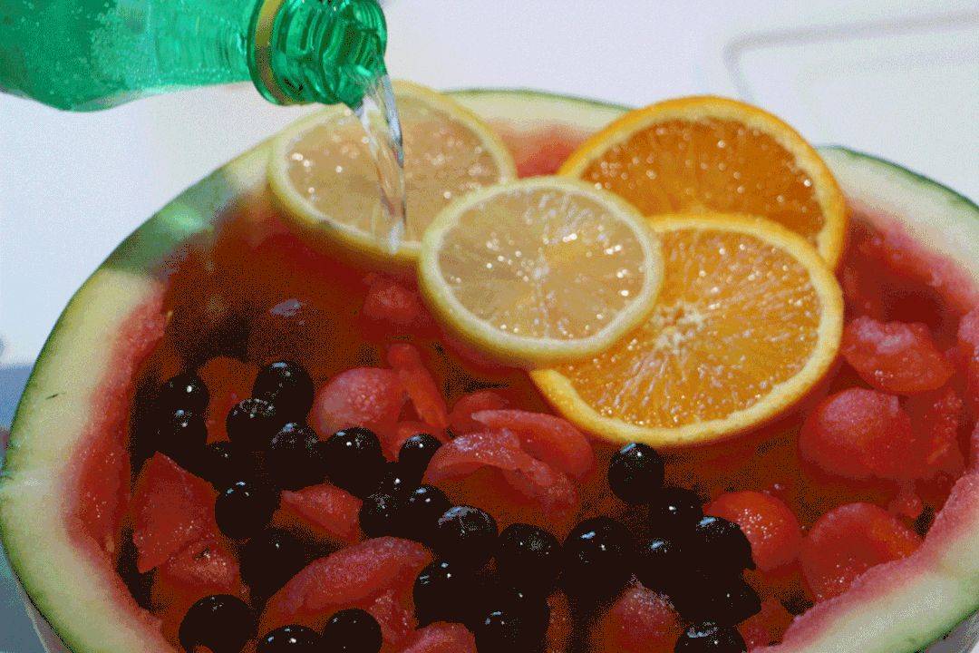 现在郊游最流行的饮品就是西瓜饮料了,挖去一半西瓜瓤,放入各种水果,最后浇上一瓶雪碧,西瓜饮料就做好了。大家拿起水杯一人一杯,碰杯的响声加上大家欢乐的笑声,此次郊游算是圆满了。