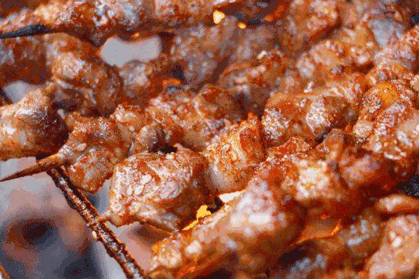 肉质鲜嫩、肥瘦相间的肉串,烤得喷香冒油!趁热吃,满口都是浓郁的肉香,细腻滑嫩,味美不膻,极有嚼劲,食肉兽真是极难抗拒啊!蔬菜也被烤出本身的香味,让人垂涎欲滴!