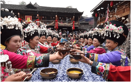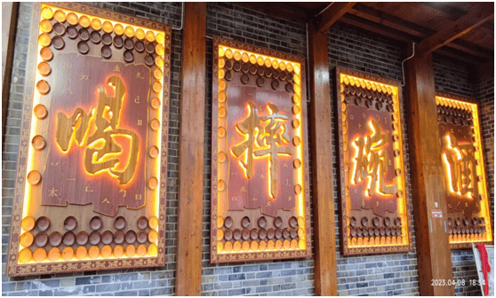 晚上七时许,此时的“女儿城”早已霓虹闪烁,灯火璀璨,“巴人堂”更是歌舞升平,人声鼎沸。我们一行六人在“女儿城”拍照留念,直到肚皮“咕咕”作响,这才想起已到了用晚餐的时间。进入“巴人堂”,我们在大堂刚落座,就听到“砰、砰、砰”的摔碗声响起,一场场“摔碗酒”正在临桌四周的客人中精彩上演。同行的阿青老师是我原工作单位的上级公司审计科科长,她客气地把菜单递了过来,而我呢,那有心思点菜啊,一个转身便钻进了闹腾的人群里,去看自己还从未见过的“摔碗酒”表演哩!