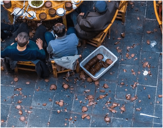 “巴人堂”中央,坐满了一桌一桌的散客,桌子不高,每个宾客坐上的都是一把把木质背椅,菜肴也都是一钵钵恩施农家土菜。看着这些人的装扮相,喝“摔碗酒”的散客大都是外来的游客,来参加喝酒、摔碗也大多是来体验、感受一下这里热闹的氛围。只见一桌桌的客人情不自禁地开始喝酒摔碗,大堂内此起彼伏,几乎是喝一口,就摔一碗,每个桌子旁都摔满了一堆堆土陶碗的碎片,满地狼藉。