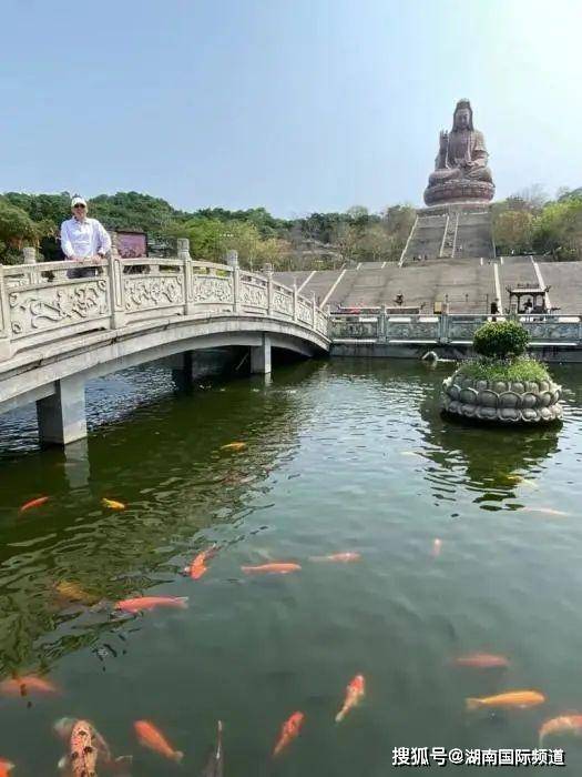 ▲ 陈健波在佛山西樵山观音像前。受访者供图