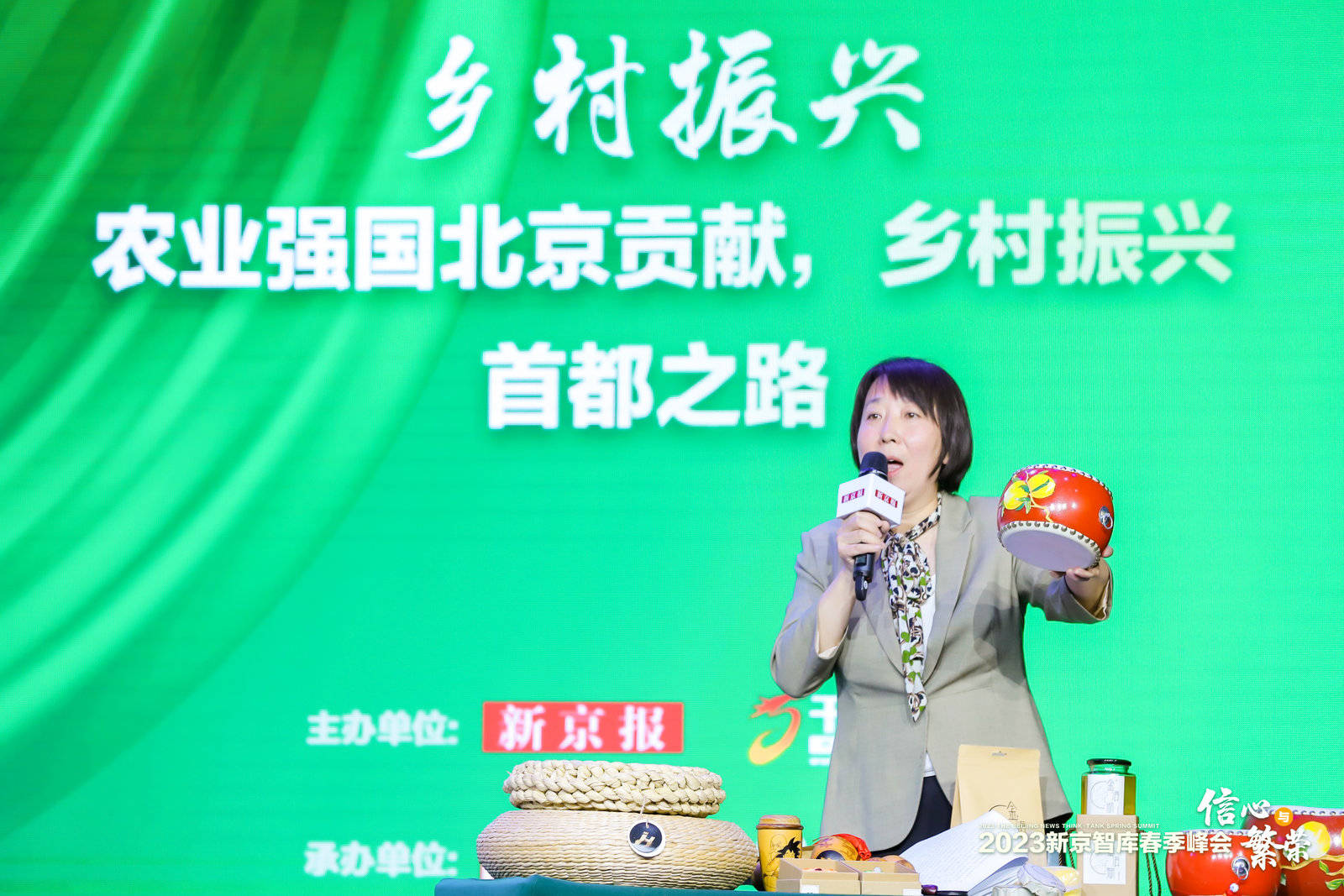平谷区金海湖镇镇长孙立妹,在信心与繁荣——2023新京智库春季峰会上展示纯手工打造的金海湖特色产品。