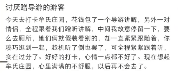 当事人申女士介绍,自己和丈夫去牟氏庄园参观游玩,花160元雇导游讲解,结果全程被一对男女跟着听,体验感很不好。