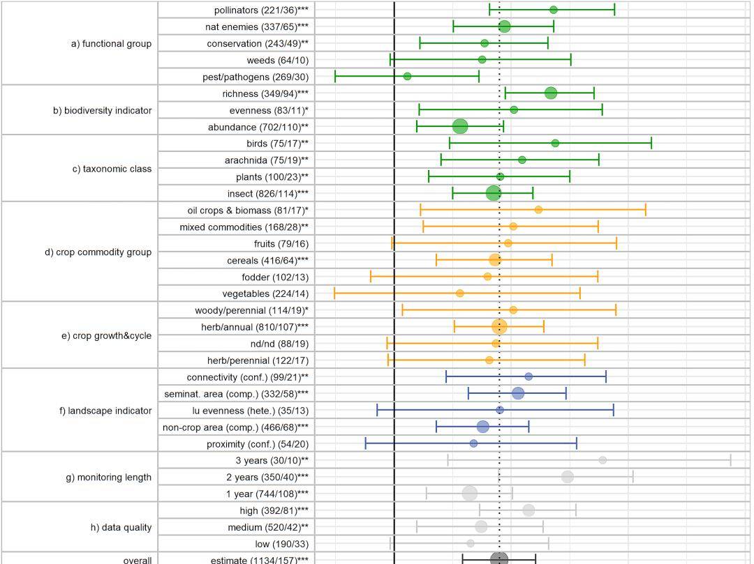 其他调节因素,即景观复杂性维度、生物多样性的位置(地上或地下)、测量范围和管理系统(高与低强度)似乎有一个无效的调节作用,因为各水平的正向、显著和重叠的间隔。这表明,具有不同生活史和觅食范围的物种通过多种生态过程从复杂景观中获益。