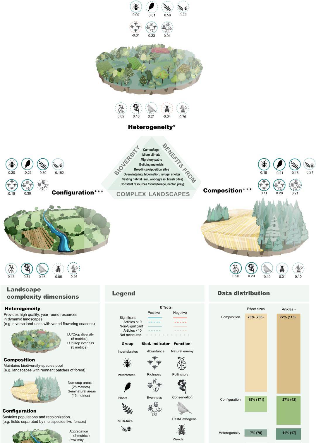 景观复杂性有三个广泛的维度,对生态过程有不同的贡献:构成(composition)、配置(configuration)和异质性(heterogeneity)。多种努力综合了景观复杂性对特定类群或功能组和种植系统的生物多样性的影响,通常使用不同的生物多样性指标(如物种丰富度、丰度或均匀度)和景观复杂性维度、指标或指标。然而,现有综述中使用的范围和指标的差异,阻碍了整合证据基础,不利于确定一致的与特定环境的结果,从而妨碍了对可用于定制农业景观中的生物多样性保护的建议。