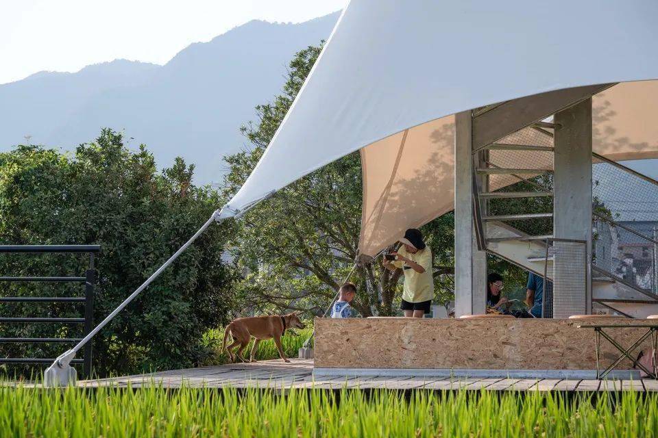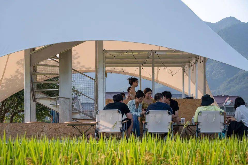 假期后面几天,附近的艺术培训机构还在这里举办了小朋友的小小画展。晚上,只要塔亭还亮着就会吸引散步的村民、游客过来乘凉,点一杯奶茶,这里成了稻田里的一座灯塔。