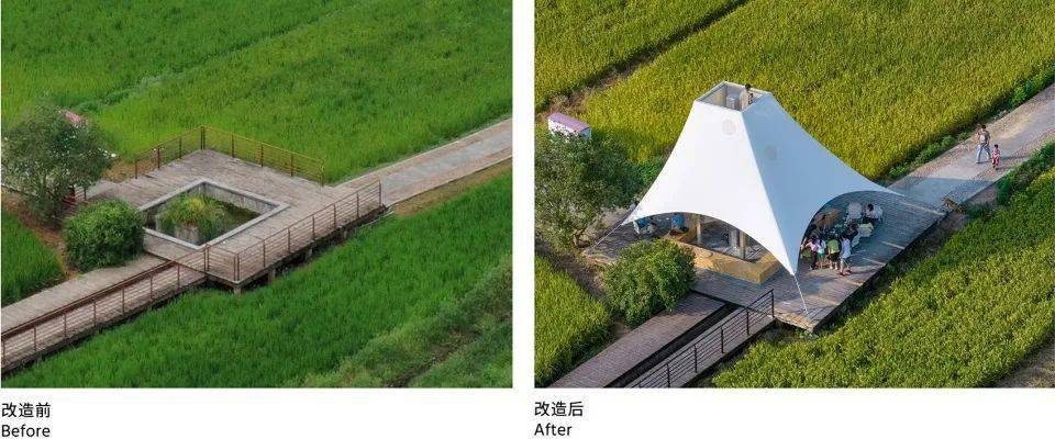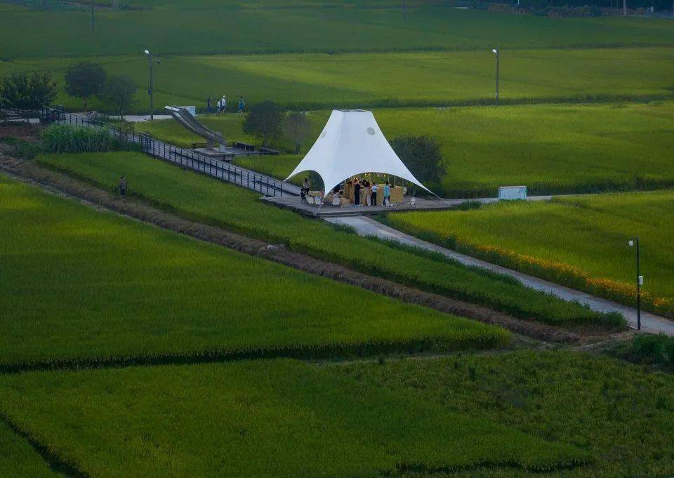 场地在稻田中间,19年这里举办了一场大地艺术节,在稻田中零星布置着艺术家的作品吸引游客的到来。作品之间距离较远,稻田中缺少可以停留的地方,所以甲方希望利用稻田中的一块现有的景观平台,在国庆节做一个7天的奶茶店和未来供村民长期使用的亭子。我们希望造一座亭子让人们可以停留、乘凉、观景,期待人们在稻田中相遇、相聚。
