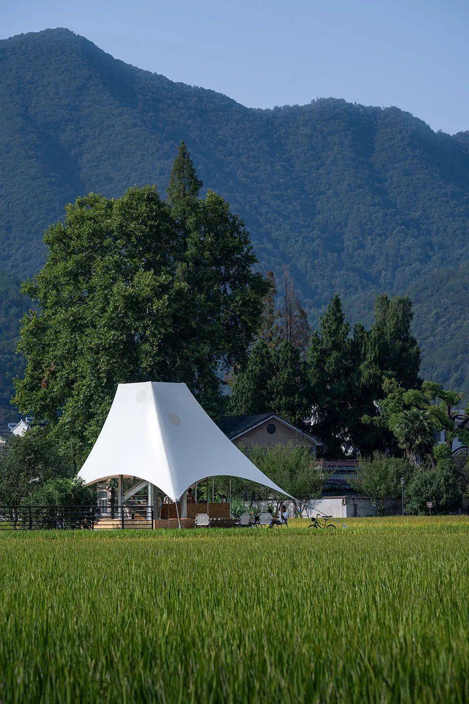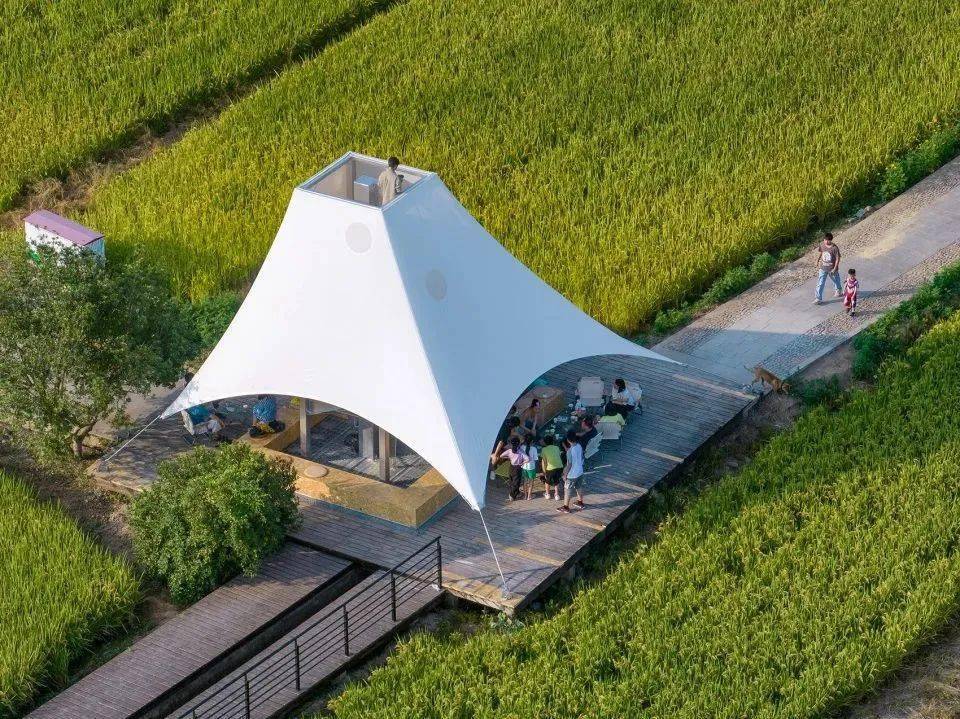 于是我们想到造一个亭子同时也是一座塔,在村口远远就能看到它,但又不是太突兀,它也像一座大帐篷,有趣、轻盈地落在稻田上,是一座可以登高远望的帐篷,帐篷之下是人们相聚的场所。帐篷上还有四个透明膜小圆洞,处在不同的高度,面向四个方向。