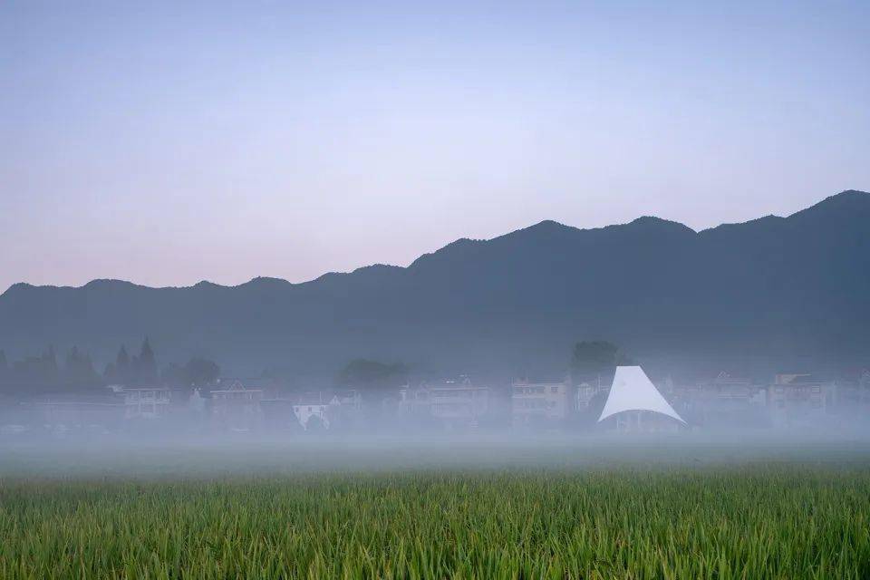 一开始我们想要搭建一组水平的亭子,作为艺术节的配套设施,自身低调,更多考虑内部与稻田的关系。甲方希望亭子满足基本功能的同时自身也需要一定的标识性,就像往年稻田中的大地艺术作品。