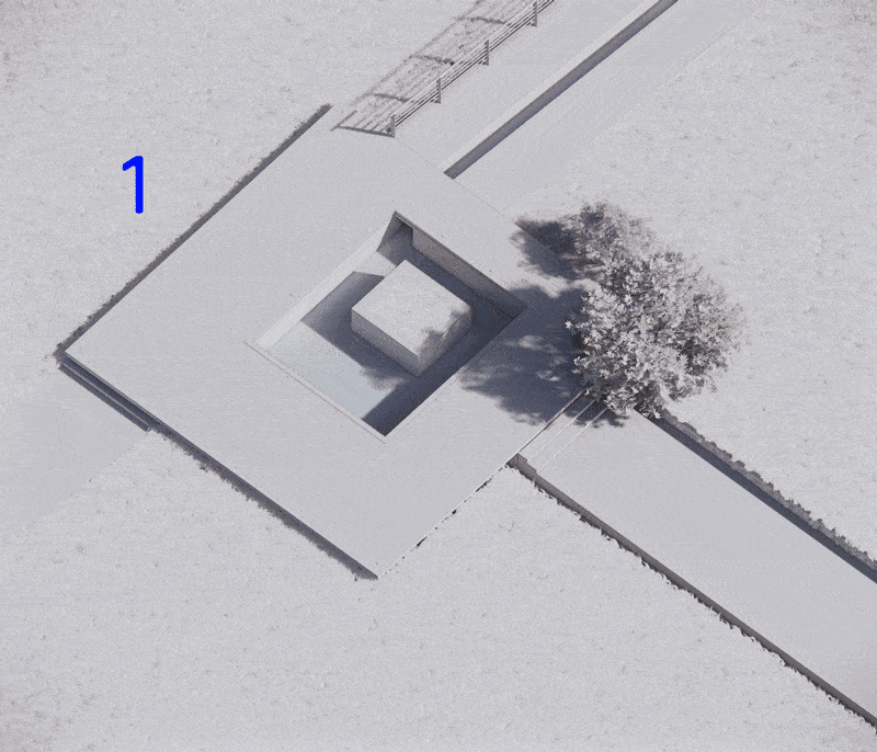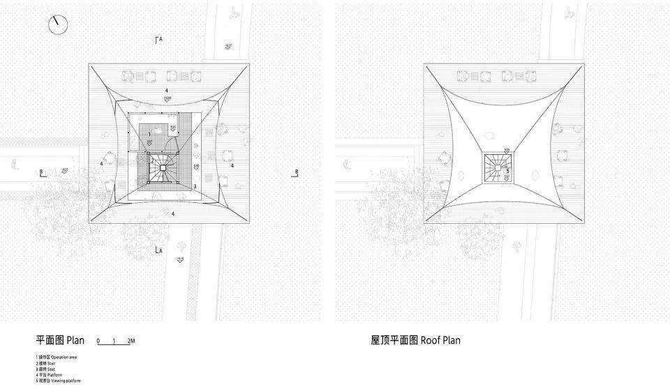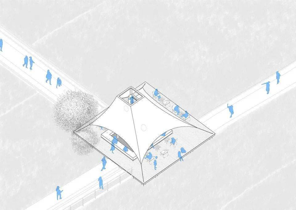 周期紧张,我们在想方案的同时也考虑了建造方式和流程,我们设想了一种快速搭建的轻型结构:塔(楼梯)在中间和架在水池上的操作空间形成一个钢结构的整体,桩基打到池底以下的持力层,形成稳定的核心结构;塔顶和平台的四角以张拉膜和钢索拉接就是亭子的屋顶,形成轻质的半透明的外部结构。亭和塔的结合自然形成了一个既符合使用又符合建造的有趣形式。