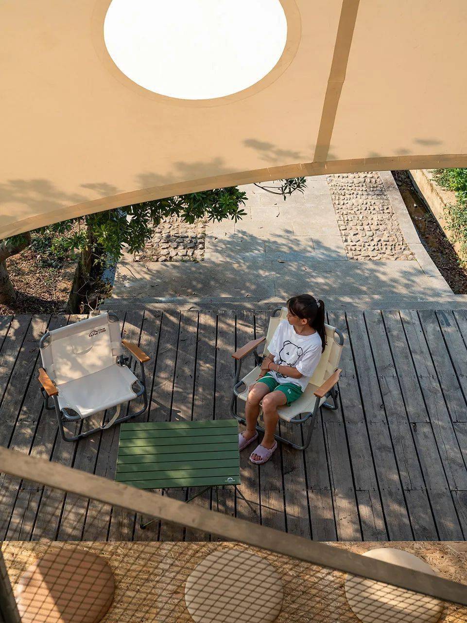 环形布局提供了这种可能,中间是服务空间和塔,四周的平台因宽度不同、面向不同而自然产生了不同的区域感:西南两侧的平台较窄,西南角我们保留现场的的两棵树,树和帐篷共同形成了阴影,自然成为一个舒适阴凉的角落;东北两侧平台较宽自然成为多人聚集的场所,尤其东侧平台没有道路连接,架在稻田之上,是与稻田最近视线最开阔的面。