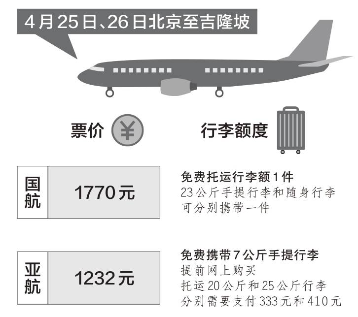虽然部分廉价航空公司被视为传统意义上的“低成本”,但加上行李托运费等服务费用后,最后的“票价”并不低。记者以4月25日、26日国航和亚航执飞的北京至吉隆坡航线为例,替读者算了一笔账——