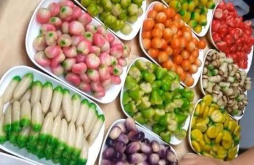 见到在摊位上走近一看才知道原来这种水果也是有玄机的,怪不得自己从来没有见过这种造型和颜色的水果,原来他并不是真的水果,而是用面粉做成的,但是这种水果吃起来还是会有一点果香味儿的,更多的就是它的甜味吃起来比较的细腻,不得不说老板真的是心灵手巧,可以把水果做的这么逼真,如果不仔细看的话真的是发现不了的。而且摊位上的这种不同造成的水果,它的味道也都是不一样的,而果香味也是非常浓郁的,另外它的外层有一层果胶看起来晶莹涕都有很多女生在看到这样的东西,估计也都抵挡不了它的诱惑,但是在吃的时候最多吃一个也就吃不下去了,但是看到这么漂亮的造型,即使买一些送给朋友也都是非常不错的,另外我们可以根据形状和颜色挑选自己想要的可以把它们组合成一个果盘也都是非常不错的。