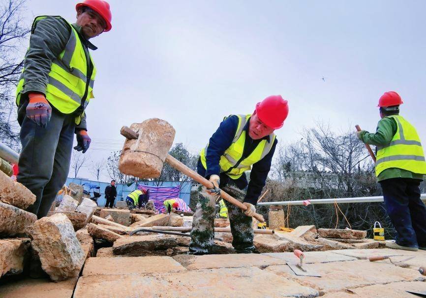 据介绍,在桥身修复时,先清除墙面杂树、杂草、苔藓,再逐一修补残缺的条石,残缺的部位采用剔凿挖补的修缮方法。针对松动部位,先将石块拨正归位,石块间保持错缝咬合,最后用白灰浆内掺江米白矾灌注石缝,整修桥身及现存泊岸。
