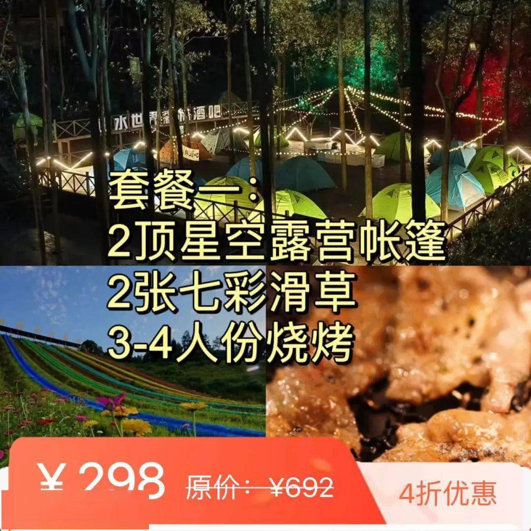 套餐一:298元:2顶星空露营帐篷+ 2张七彩滑草票+3-4人份烧烤