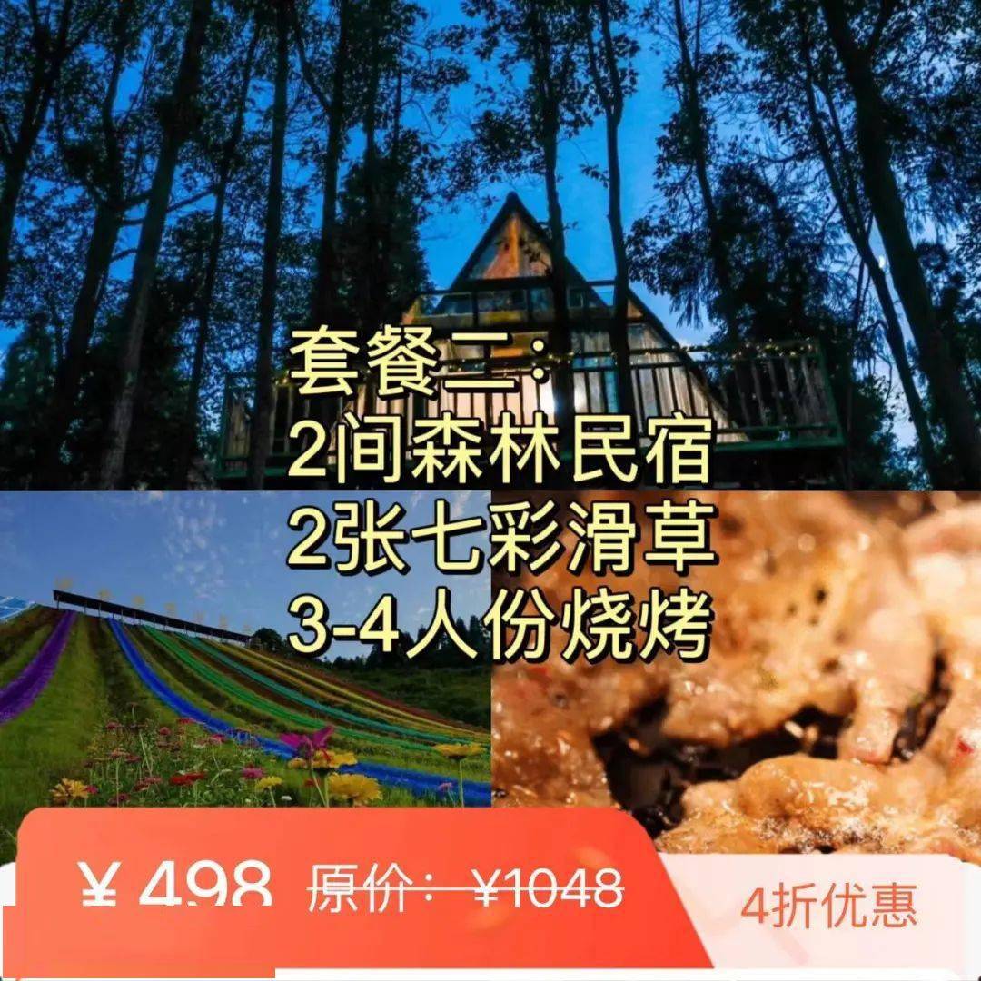 套餐二:498元: 2顶星空露营帐篷+2张七彩滑草票+3-4人份烧烤
