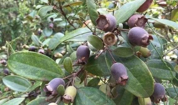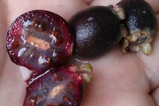 熟透了是桃金娘是紫黑色的,跟蓝莓的大小是差不多的,桃金娘的果子跟蓝莓的果子非常的相似,几乎是一模一样了,但是桃金娘的果肉也是紫黑色的,流出来的汁水也是,非常的纯正,味道甘甜,比蓝莓好吃多了。