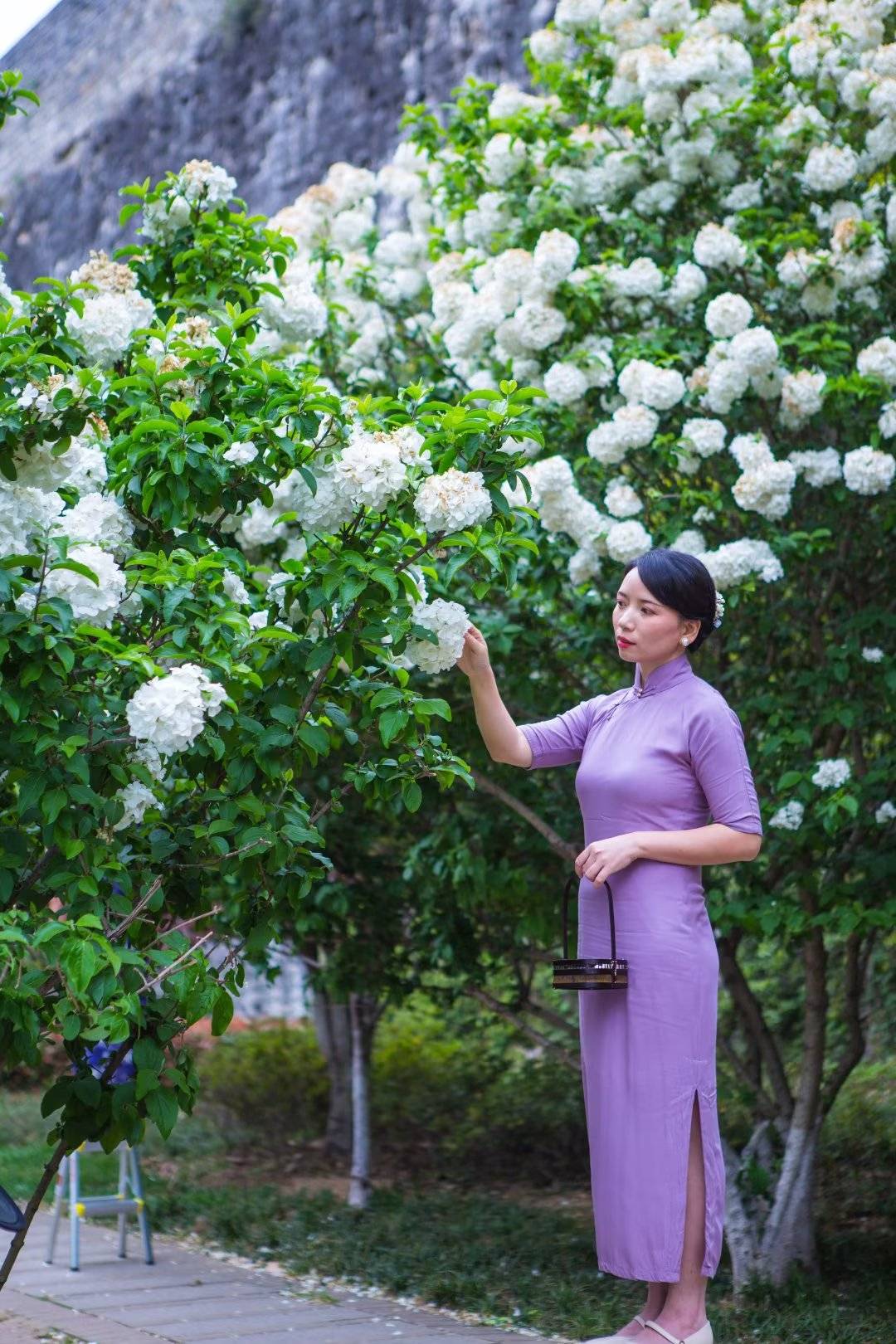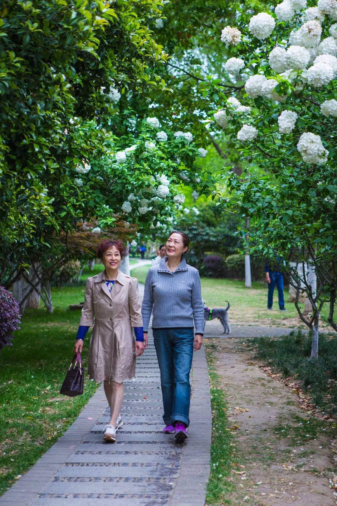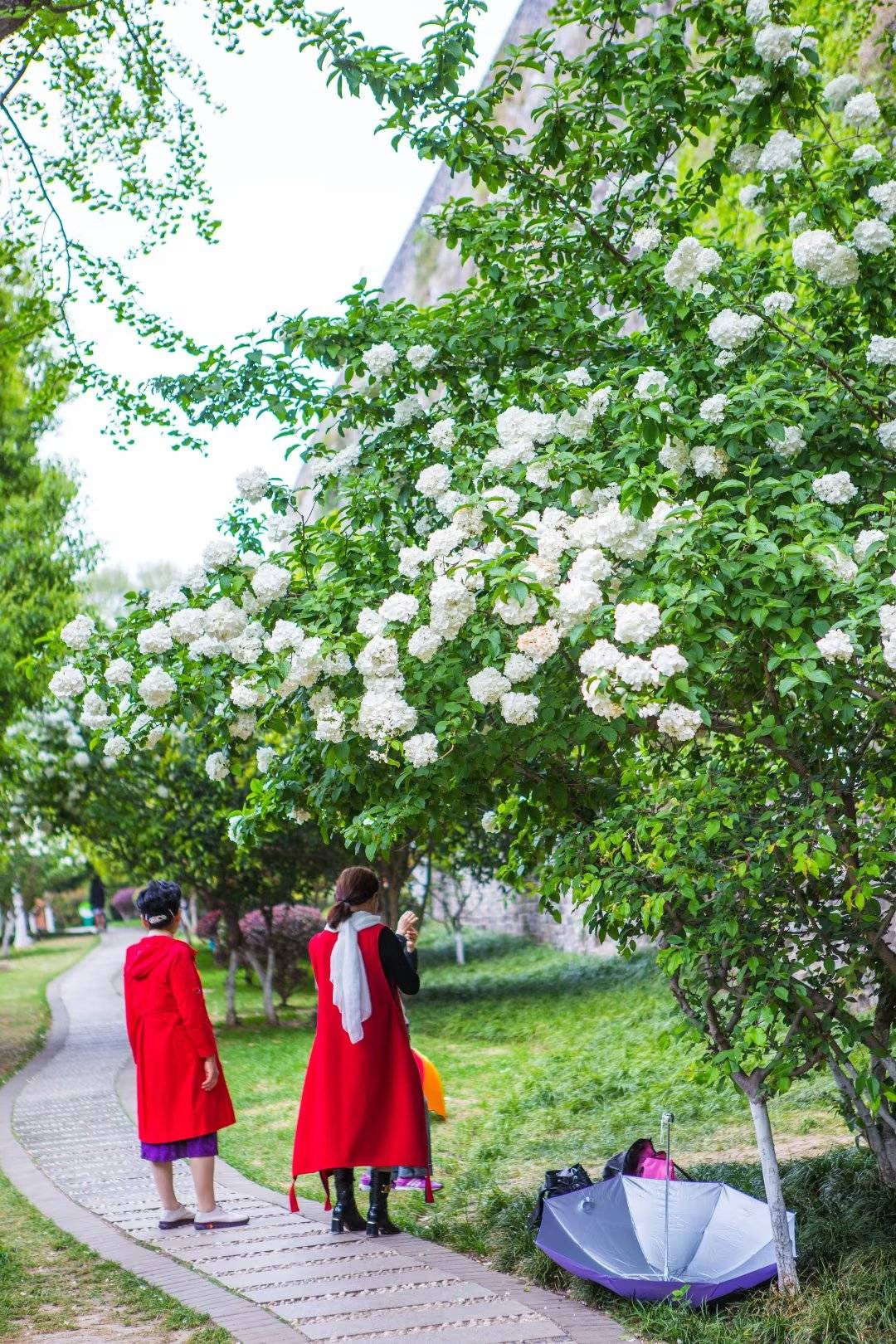 木绣球属于忍冬科荚蒾属植物,为落叶或半常绿灌木,每棵树上都有几十朵绣球花,花开莹白如雪如明月,团团玉花满缀枝头,自带一股清透的遗世独立气质,惹人怜爱。树荫下结伴赶来的年轻人争相与绣球花合影,不少拍照达人拿着“长枪短炮”聚焦帅哥靓女,留下一张张别有韵味的合照。