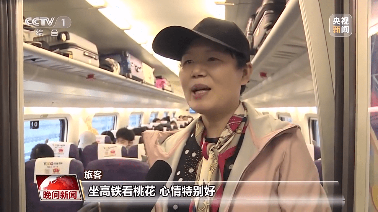 旅客:坐高铁看桃花,心情特别好,这种出行方式给我们带来了便捷,比较经济实惠。