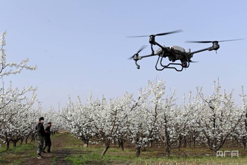 南安村村民借助植保无人机为梨树授粉(央广网发 刘亮亮 摄)